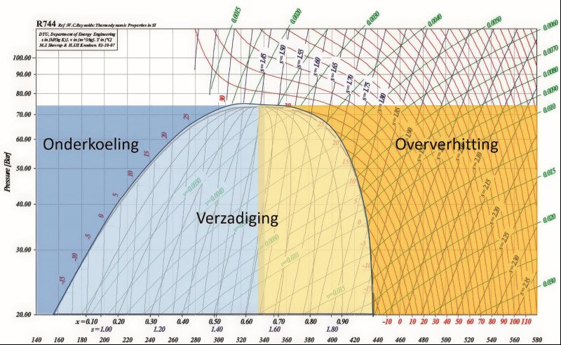 Oververhitting treedt op wanneer een koudemiddel in de gasfase op verzadigingstemperatuur verder verwarmd wordt bij gelijkblijvende druk.