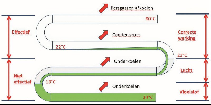 N.B. in systemen met een vlotter met interne ontgassing zal wellicht geen onderkoeling meetbaar zijn, niettegenstaande dat er toch niet-condenseerbaar gas in het systeem kan zitten. Dit kan immers circuleren door deze ontgassing.
